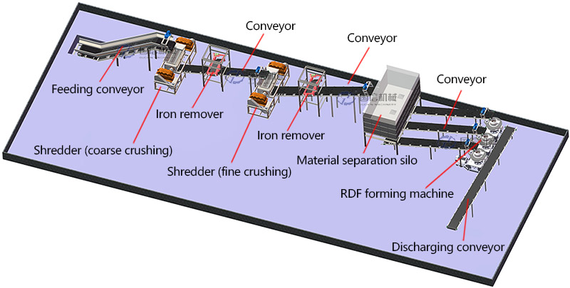 2. Sistem pengangkutan: Gunakan ban berjalan, pengumpan getar, atau konveyor sekrup untuk mengangkut limbah secara merata ke setiap unit pemrosesan guna memastikan kelancaran pengoperasian jalur produksi.