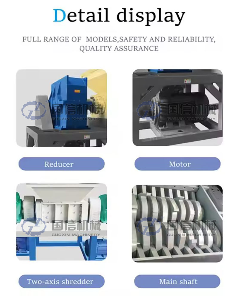 2. Mesin penghancur sampah poros ganda, kecepatan rendah, torsi tinggi dengan pemotong baja yang diperkeras;